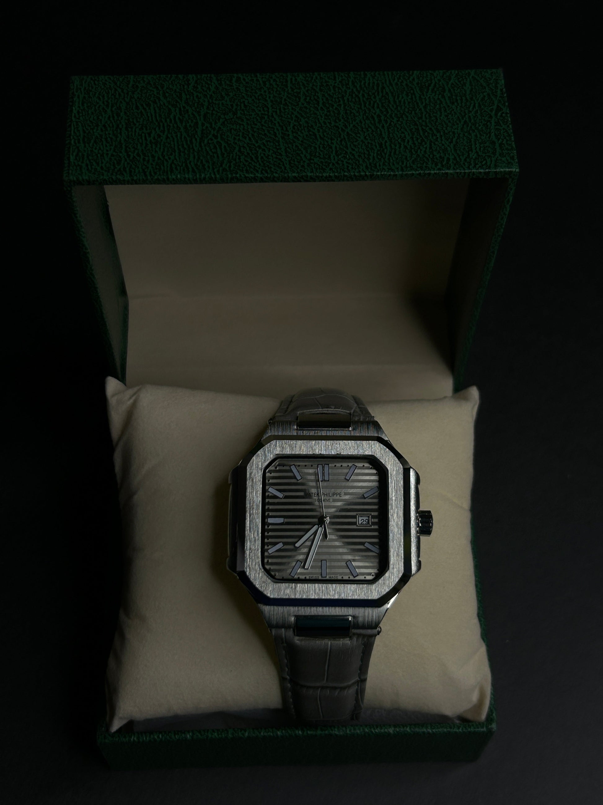 Discover the art of timeless sophistication with this striking Patek Philippe-inspired luxury watch. Showcasing a bold square-shaped case with a brushed stainless-steel finish, this piece exudes contemporary elegance while honoring classic design cues.