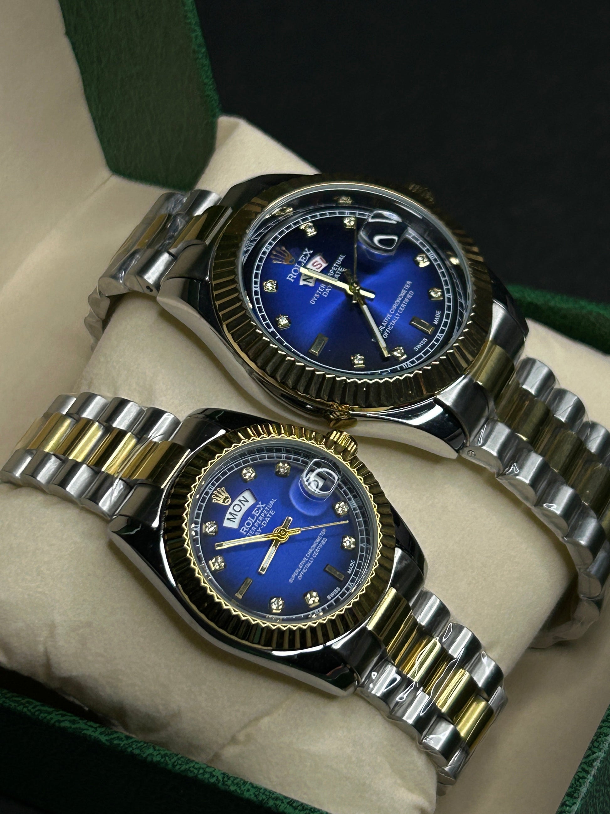 Luxury Two-Tone Rolex Day-Date Couple Watch Set – Royal Blue Dial